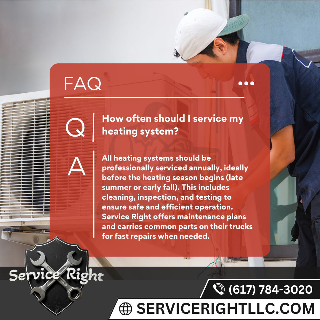 All heating systems should be professionally serviced annually, ideally before the heating season begins (late summer or early fall). This includes cleaning, inspection, and testing to ensure safe and efficient operation. Service Right offers maintenance plans and carries common parts on their trucks for fast repairs when needed.